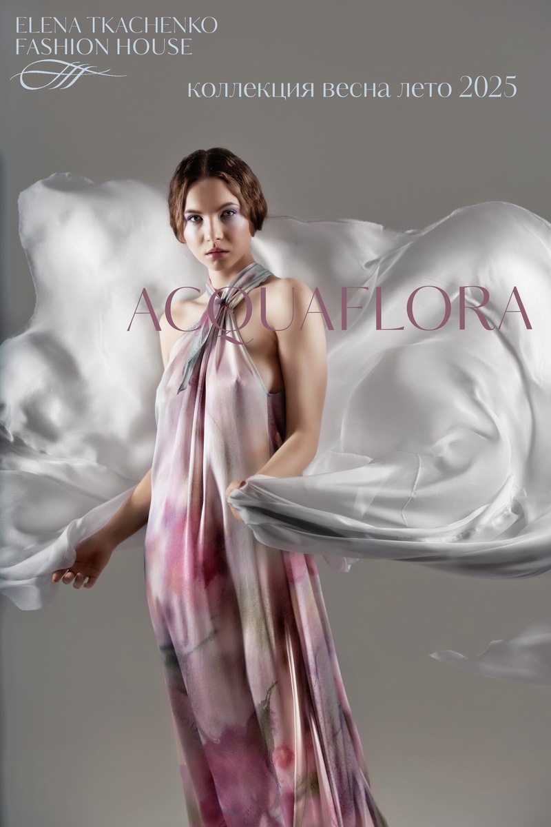AСQUAFLORA – это диалог акварели и шёлка. Для воплощения замысла художником-модельером Еленой Ткаченко было создано около семидесяти уникальных композиций для платков, шарфов, палантинов, купонов блуз, юбок, брюк и платьев. В композицию каждого принта включены: название коллекции «ACQUAFLORA» (в латинском написании), логотип Модного Дома ELENA TKACHENKO, роспись художника Елены Базановой и цитата английского поэта Альфреда Теннисона: «И если бы только при каждой мысли о тебе вырастал цветок, я мог бы бродить по своему саду вечно...».