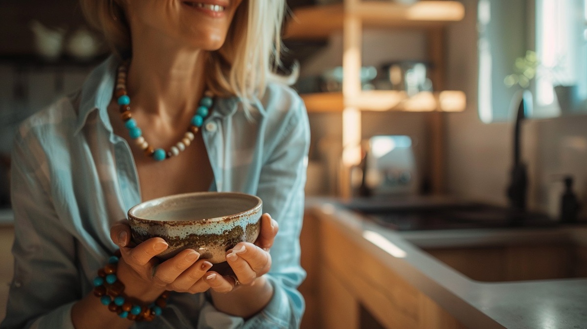 Создано на основе запроса: A woman sitting in a bright kitchen, smiling gently, holding a bowl with both hands close to the camera. On her right wrist, a vivid bracelet with tiger eye and blue apatite beads is clearly visible. Clean wood textures, sunlight.