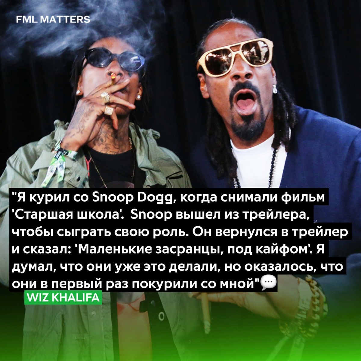 🤝 WIZ KHALIFA СЛУЧАЙНО НАКУРИЛ ДЕТЕЙ SNOOP DOGG! В интервью «DJ Whoo Kid» Уиз признался, что во время съёмок фильма случайно дал попробовать марихуану сыновьям Снуп Догга, Корде и Корделлу. На тот момент Корде было около 18 лет, а Корделлу — около 15. Он думал, что, раз это дети Снупа, то они уже пробовали марихуану. 💀 FML MATTERS