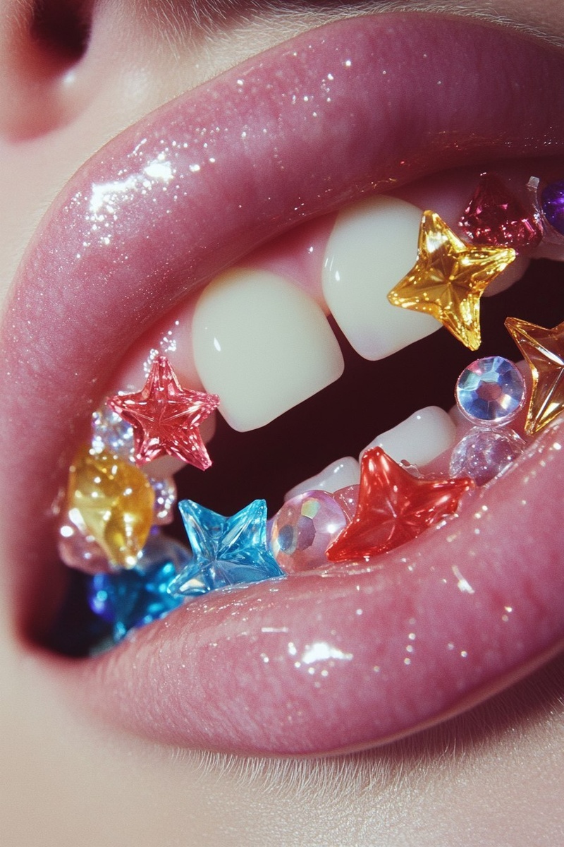 Создано на основе запроса: Close-up of a mouth with colored gems and plastic stars on the teeth, the front teeth have a big gap, in the style of David LaChapelle and Petra Collins for Vogue magazine.