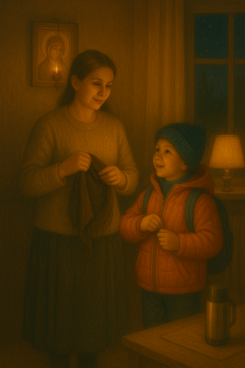 Коля тут же встрепенулся. Взял свечку — крепко, двумя руками, как драгоценность. Рядом — мама, с серьёзным, радостным лицом. Вокруг — темнота, как в сказке. Над головой — звёзды. Холодный воздух ночи обнимает, и от этого огонёк в ладонях кажется ещё теплее, почти живым.