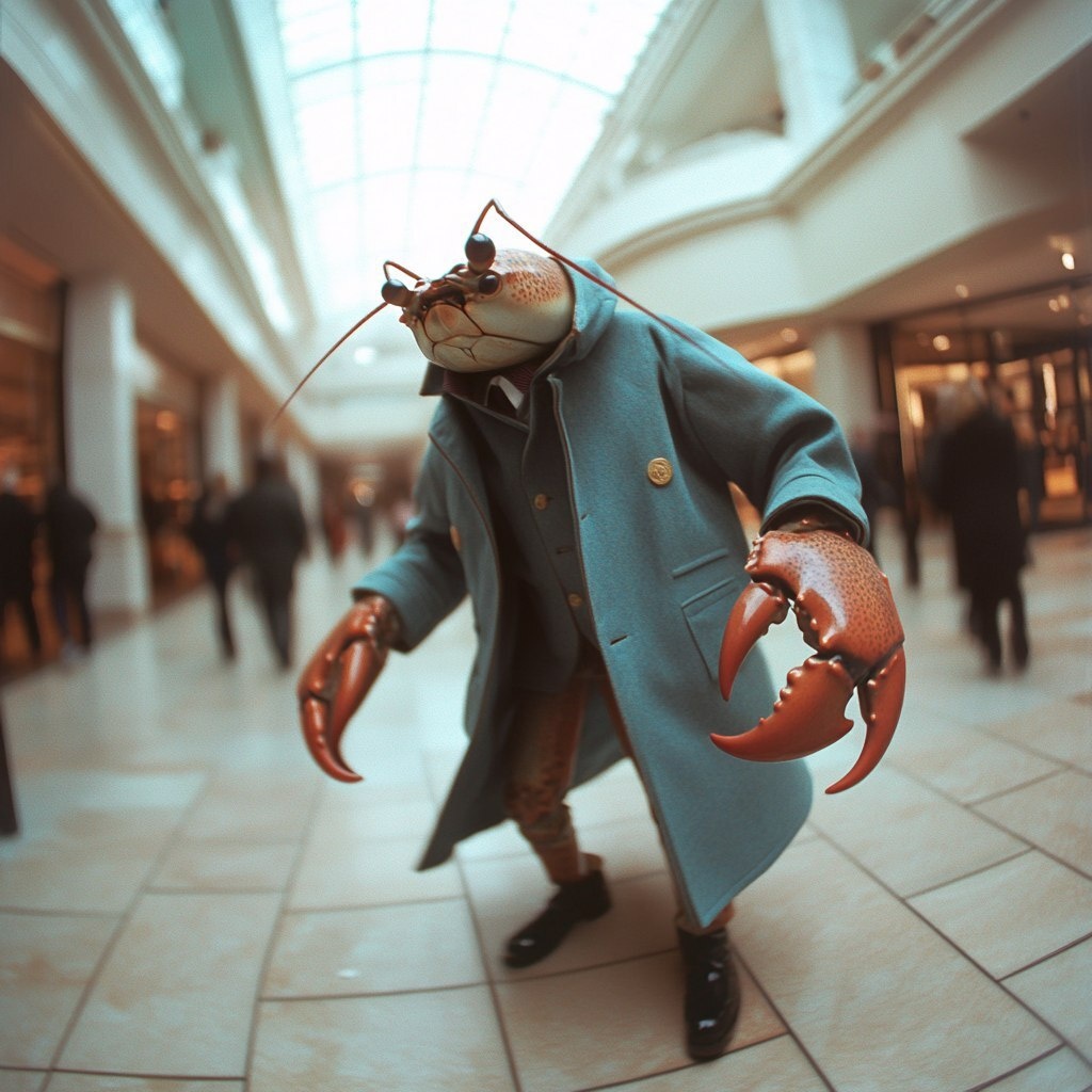 Создано на основе запроса: anamorphic well dressed, in a blue ralph lauren coat, crustacean walking in the mall