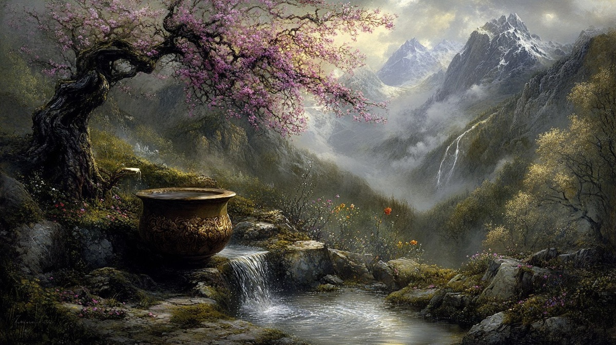 Создано на основе запроса: a Springtime landscape with a mountain range in the distance and a Willow Tree next to a winding brook in the foreground. There is an old stone wall and blossoming wildflowers. In the art style of by Myles Birket Foster and by Marjolein Bastin, 64K UHD resolution, Topaz Gigapixel clarity, --- Автоперевод: Весенний пейзаж с горным хребтом на расстоянии и деревом ивы рядом с извилистым ручьем на переднем плане. Классно получилось? 🤔 https://dzen.ru/id/65c0c65c86e4f837c27b24d7 #ИИ #AI #нейросеть #midjourney #art