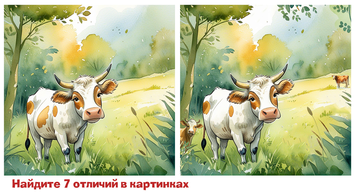 Найди 7 отличий. Упражнение на внимательность в компании коровы.