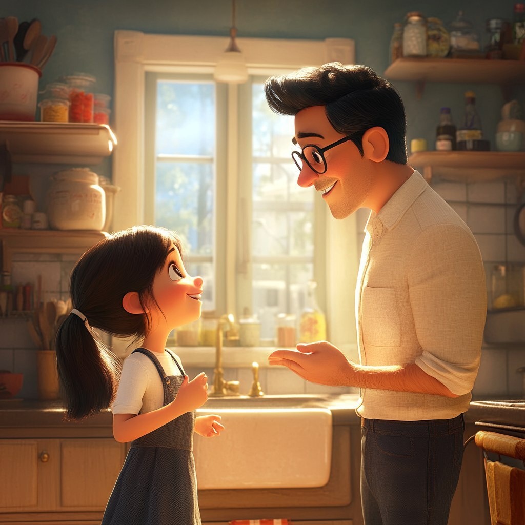 Создано на основе запроса: father with glasses talking to his little girl in the kitchen with a smile on their faces, pixar style