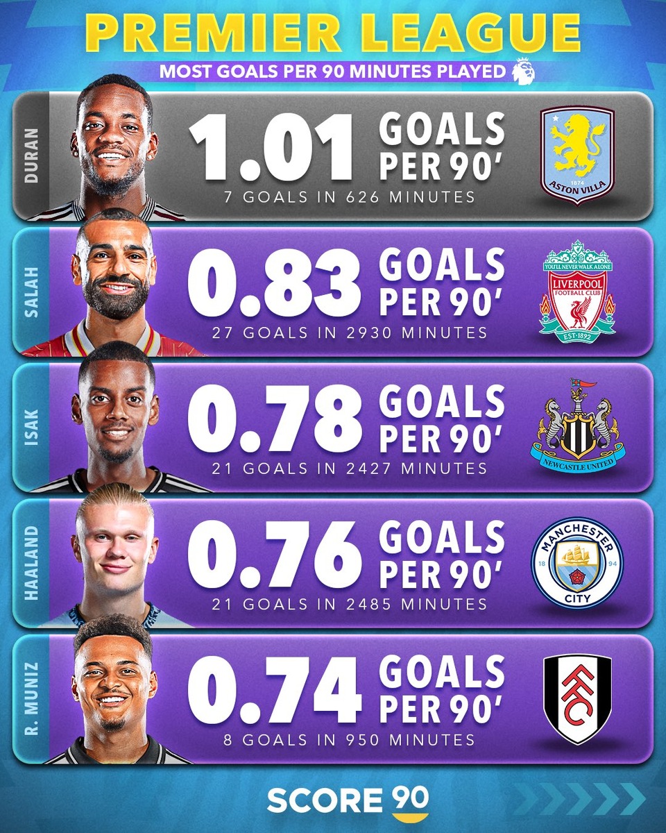 Мо Салах в текущем розыгрыши Премьер-лиги остается лучшим бомбардиром чемпионата: 27 голов и 18 ассистов. В среднем египтянин забивает 0,83 гола за матч – это второй лучший показатель лиги. Портал Score90 составил рейтинг футболистов АПЛ по среднему количеству голов за 90 минут. Первое место занял Джон Дуран, зимой перешедший из «Астон Виллы» в «Аль-Наср»: за 626 минут в АПЛ колумбиец успел забить семь голов, в среднем за игру он отличался чуть больше одного раза. Александер Исак (21 гол и шесть ассистов) и Эрлинг Холанд (21 гол и три ассиста) идут сразу за Салахом – точно так футболисты располагаются и в топе лучших бомбардиров английского первенства. А замыкает рейтинг Родриго Муниз из «Фулхэма». Лидеры АПЛ по среднему количеству голов за 90 минут в сезоне-2024/25 Как оцените такой взгляд на расстановку бомбардирских сил в лиге? Русские судьи удалили партнера Роналду, и он обезумел: выбил мяч и пошел разбираться 👊 Олисе и Рафинья – лидеры топ-5 лиг Европы по важному атакующему показ