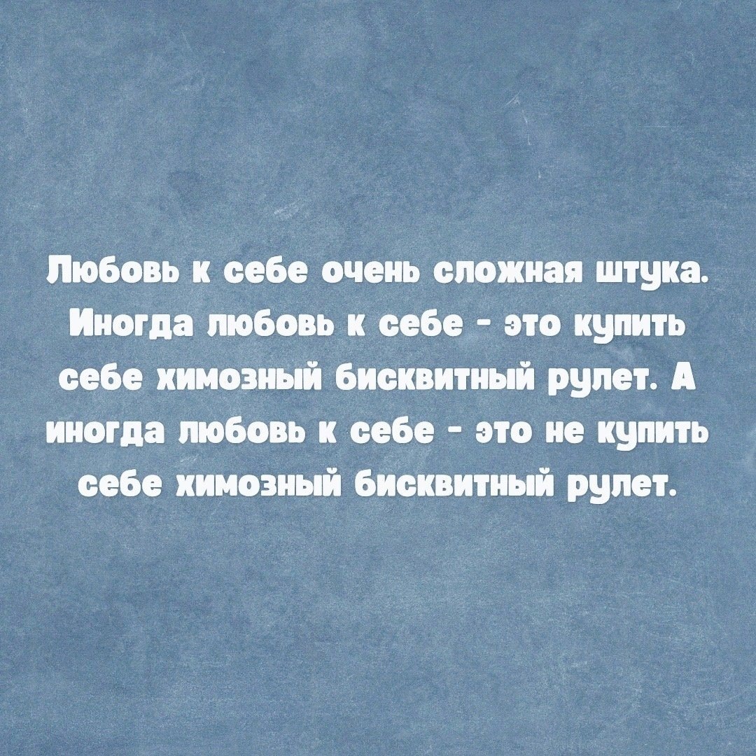8. Иногда, кстати, вредная еда. Если вам так, действительно, лучше. Я прикрепила картинку к этой статье, в которой вся суть этого пункта, и которая мне очень нравится). "Любовь к себе сложная штука. Иногда любовь к себе - это купить себе химозный бисквитный рулет, и съесть его. А иногда любовь к себе - не купить химозный бисквитный рулет."