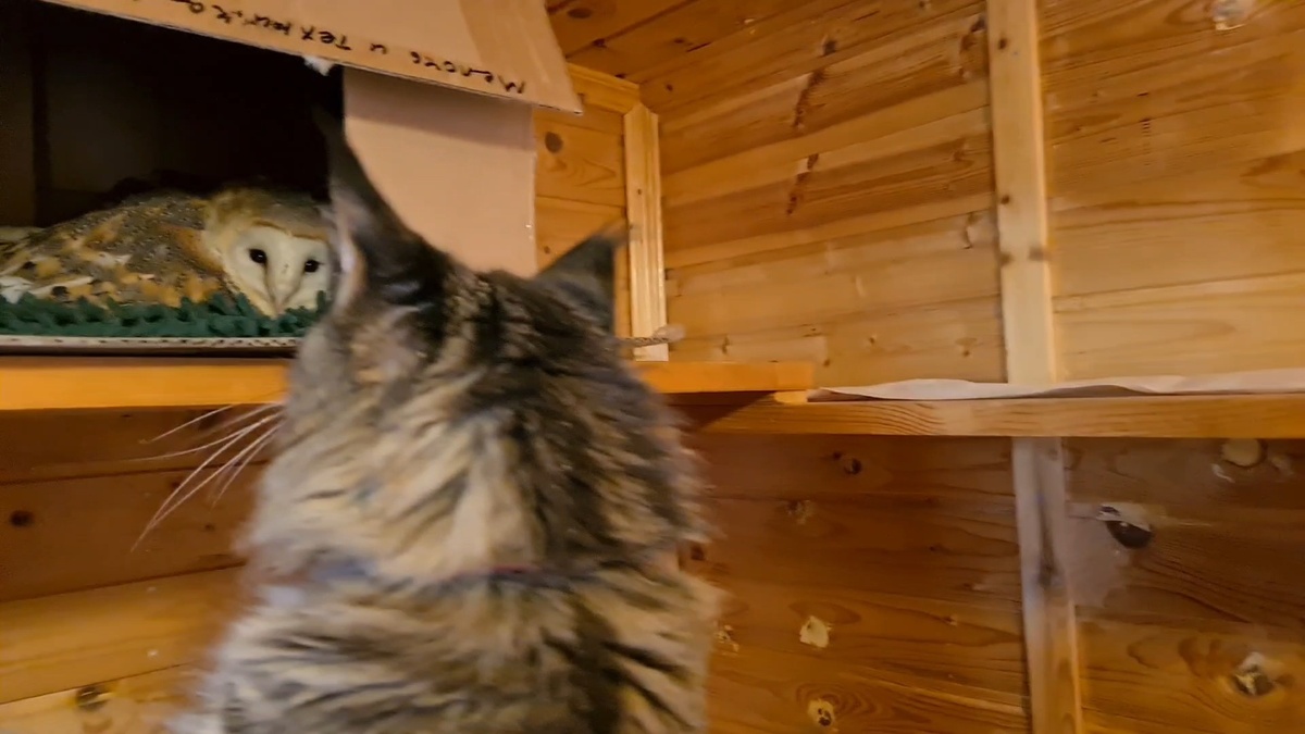 Кошка Морошка проверяет сову сипуху Пухню. Сычу Лучику кто-то плешь проел. Мотылёк совиного цвета