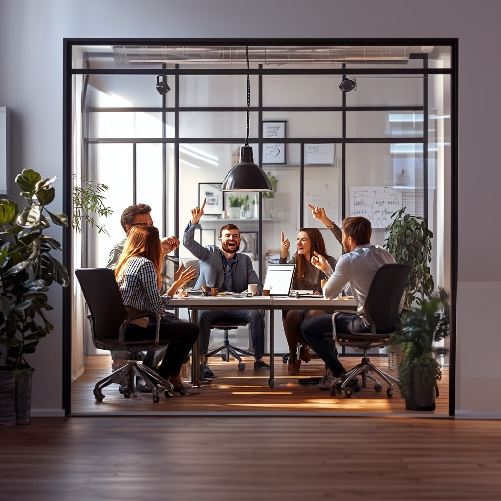 Создано на основе запроса: a room with 4 individuals having fun while working together on a teamwork project in a conference room