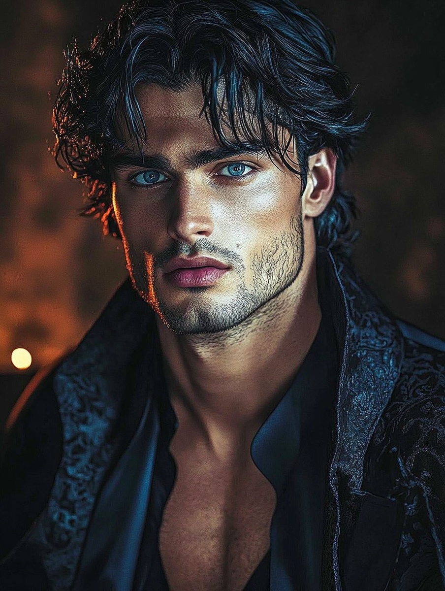 Создано на основе запроса: dark-haired man with blue eyes, wearing a gothic-style coat and shirt, muscular chest, in a dark fantasy setting