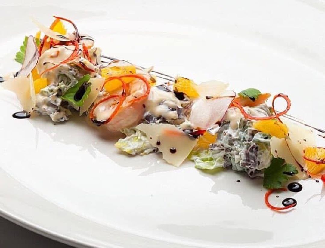 #Рецепт( рыбы ) закуски на завтрак ! ЛОСОСЬ( можно на гобушу ) в сливочно-соевом соусе с сочными листьями салата с сыром фета и апельсином 👨🏼🍳👩🏻🍳 Лосось свежий (филе) – 100 гр Сливки 33% - 50 гр Апельсин – 1 шт Оливковое масло – 10 гр Соевый соус – 5 гр Салат Лолло Росса – 60 гр Сыр Фета– 50 гр Сметана 30% - 20 гр Огурец – 30 гр Крем-бальзамик – 5 гр Сыр Пармезан – 10 гр Способ: лосось (филе) нарезаем на крупный кубик обжариваем на сильном огне со всех сторон по 30 сек, затем уменьшаем огонь, добавляем сливки, филе апельсина и томим 5 мин. до загустения соуса, помешивая (при нагреве соевый соус меняется по вкусу, поэтому добавляем в конце). Листья Лолло Росса рвем, добавляем сыр фета, нарезанный мелким кубиком, сметану и огурц, нарезанный соломкой и аккуратно перемешиваем руками. Выкладываем кусочки лосося на тарелку, сверху салат формируем на небольшие шарики лосося, поливаем соусом, в котором готовился лосось, сбрызгиваем крем-бальзамиком, украшаем пармезаном. Очень вкус