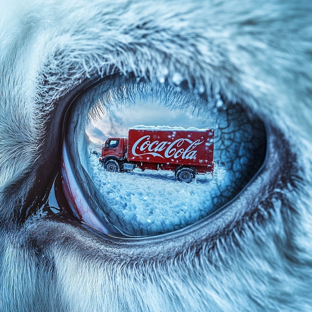 Создано на основе запроса: In the extreme close-up of a polar bear dark eye, the textured surface of the iris looks like a radial landscape tiny grooves and color striations radiate outward in shades of icy blue and soft gray. The glossy curve of the cornea catches the light, and within the reflective surface of the iris, a slightly foggy red truck with a white Coca-Cola logo is mirrored. The truck appears small, distant, and curved slightly by the eye’s spherical surface, as if driving across the landscape of the reflection itself. Surrounding the truck are hints of white snowy ground and a soft twilight sky. --- Автоперевод: В крайнем крупном плане темного глаза белого медведя текстурированная поверхность радужной оболочки выглядит как радиальный ландшафт крошечные канавки и цветовые полосы, излучаясь наружу в оттенках ледяного синего и мягкого серого. Как тебе эта генерация? 🤔 https://dzen.ru/id/65c0c65c86e4f837c27b24d7 #ИИ #AI #нейросеть #midjourney #art