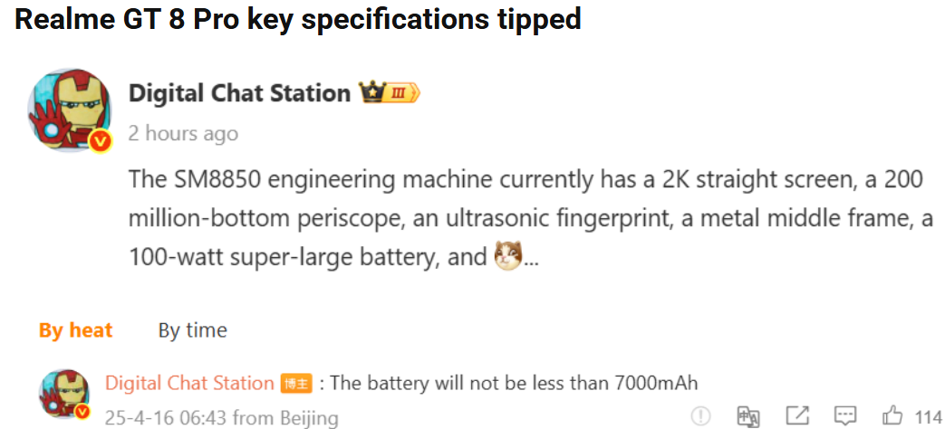 Предполагается, что компания Qualcomm представит следующий флагманский чипсет Snapdragon 8 Elite 2 в октябре этого года. Вполне ожидаемо, что несколько брендов, включая Realme, представят свои флагманские телефоны, оснащенные новым чипом. В ноябре 2024 года компания анонсировала Realme GT 7, оснащенный чипом Snapdragon 8 Elite. Вероятно, Realme GT 8 Pro может дебютировать примерно в то же время в Китае. Новое сообщение на Weibo от известного инсайдера Digital Chat Station раскрывает основные характеристики будущего Realme GT 8 Pro. По словам инсайдера, инженерный прототип смартфона Realme на базе Snapdragon 8 Elite 2, который, по-видимому, является моделью Realme GT 8 Pro, оснащен плоским OLED-экраном, поддерживающим разрешение 2K. Как и его предшественник, следующий флагман компании по-прежнему будет оснащен ультразвуковым сканером отпечатков пальцев в экране. Задняя камера Realme GT 8 Pro будет включать 200-мегапиксельный перископический телеобъектив. Инсайдер также упомянул, что сма