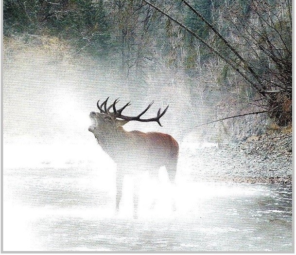 Вдруг в серых клубах тумана появилось сначала более темное пятно, из которого, с очередным всплеском воды под копытом, проявился ОН. Красивая голова на мощной шее, украшенная здоровенными, ветвистыми, мощными рожищами. Густая седая грива на широкой грудине. Пар горячего дыхания смешивается с туманом. Красавец!