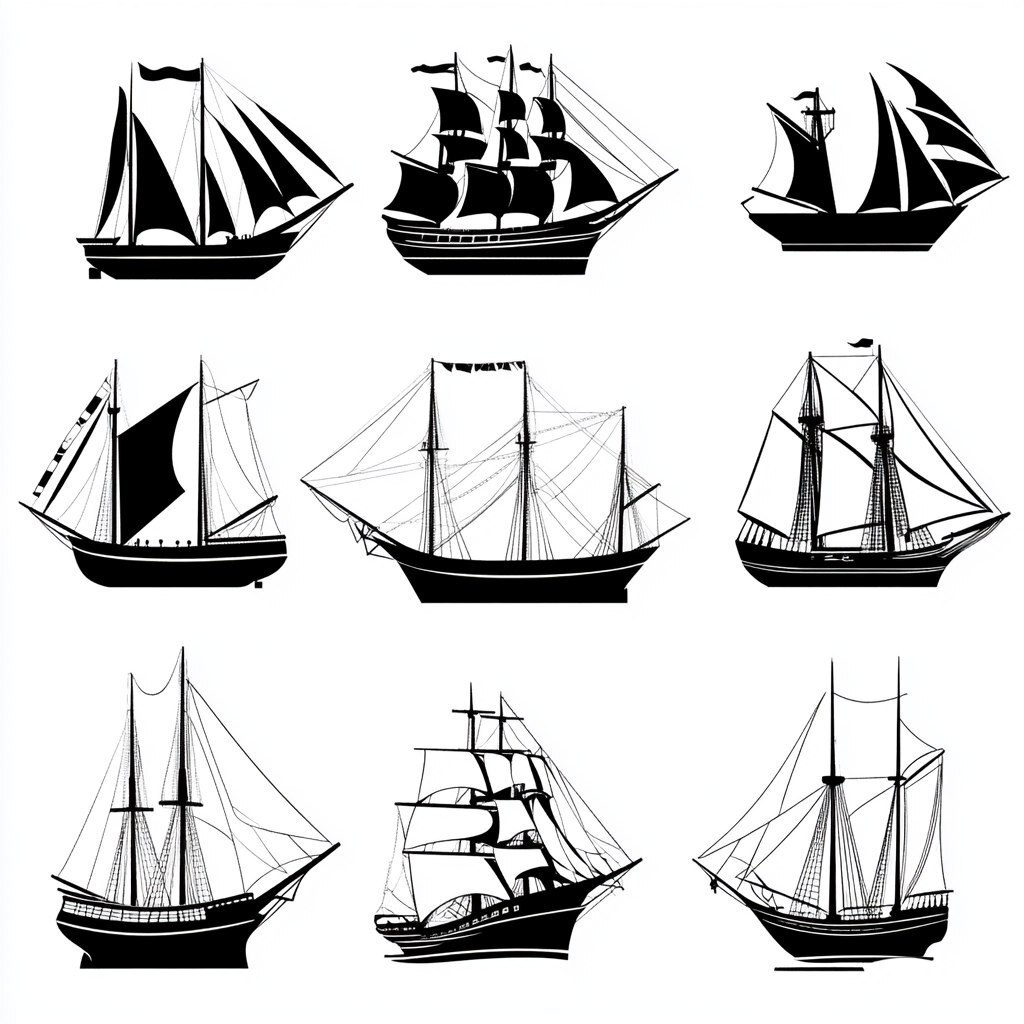 Создано на основе запроса: black and white simple clipart of different types of ships