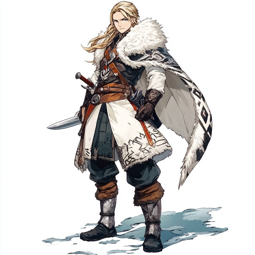 Создано на основе запроса: Fantasy concept illustration, Male, Human, Bob hair, Fur coat, Dagger on the belt, Heavy boots, Travel Norse