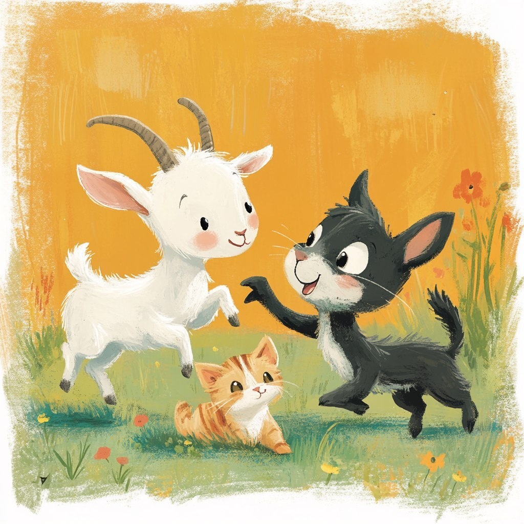 Создано на основе запроса: a children's book illustration of a baby goat, cat, and dog playing together