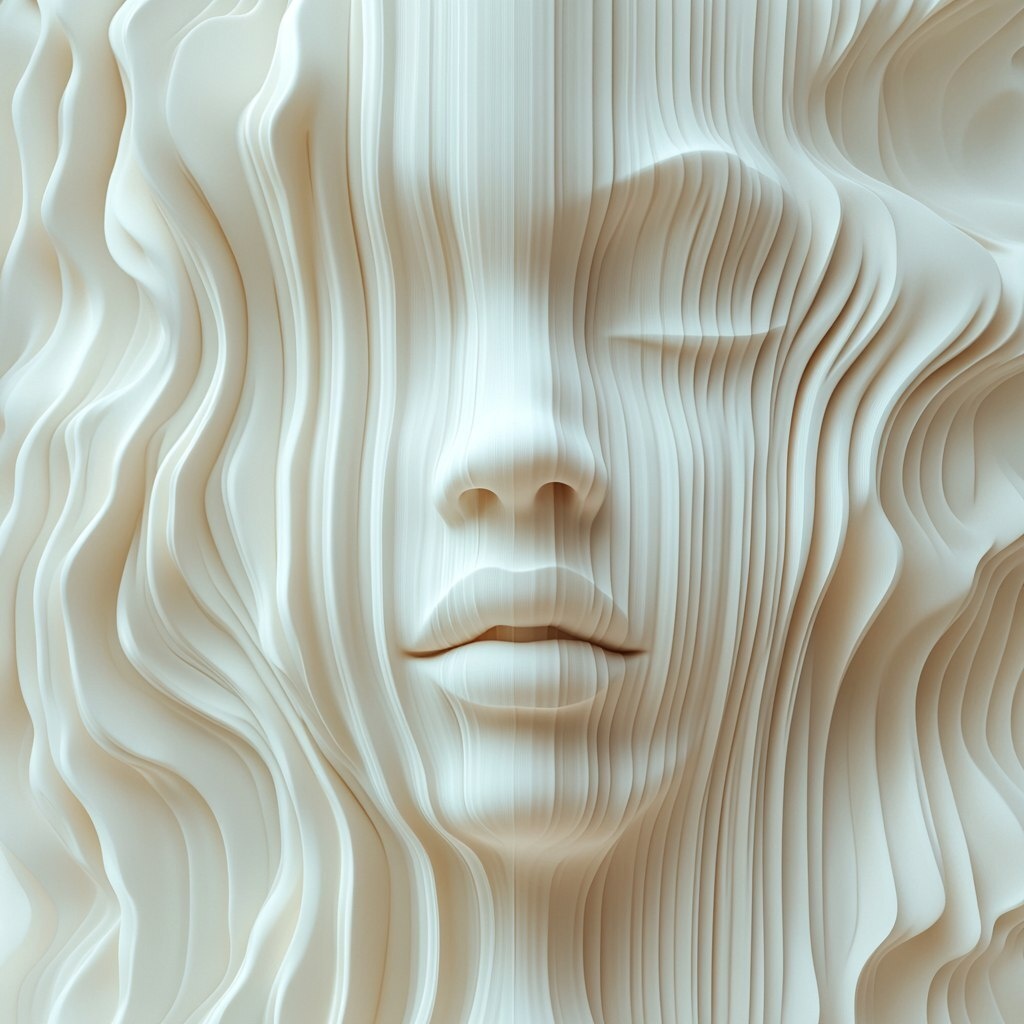 Автоперевод: Сюрреалистическое абстрактное лицо человека, появляющееся через вертикальные мягкие упругих волн, гладкую кинетическую текстуру, поверхность с жидкой ребристыми, оптическими иллюзиями, гипердисменное, мягкое освещение, спокойные нейтральные тона, стиль трехмерной ткани, иммерная современная художественная установка