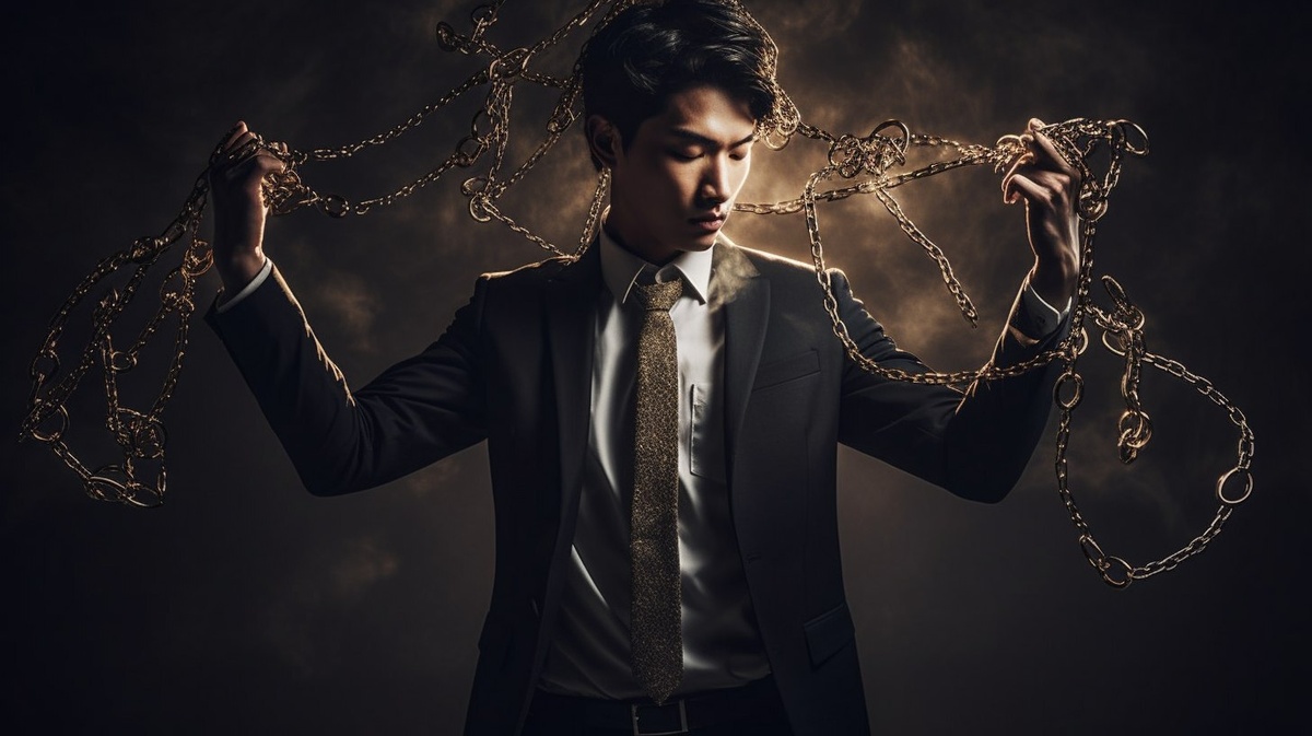 Создано на основе запроса: Making variations for image #2 with prompt A hyper-detailed, emotionally charged portrait of a professional in sleek modern attire captured in the powerful moment of breaking free from golden shackles, with the broken links suspended mid-air, glinting in soft light. He is Asian. The figure stands tall, surrounded by a halo of diffused light and gentle motion --- Автоперевод: Создание вариаций для изображения № 2 с помощью быстрого обездоленного, эмоционально заряженного портрета профессионала в изящном современном наряде, захваченном в мощный момент вырыва от золотых кандалов, с разбитыми звенами, подвешенными в воздухе, блестящим в мягком свете. Необычно получилось? 🤔 https://dzen.ru/id/65c0c65c86e4f837c27b24d7 #ИИ #AI #нейросеть #midjourney #art