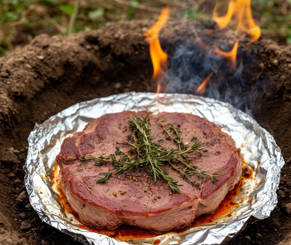 Приготовление мяса в фольге в яме в земле — это традиционный способ запекания, который позволяет получить очень сочное и ароматное блюдо. Вот пошаговый рецепт: - Мясо (свинина, говядина или курица) — 1-2 кг - Специи по вкусу (соль, перец, паприка, чеснок, травы) - Овощи (по желанию): картофель, морковь, лук - Фольга - Листья (например, виноградные или капустные) — для обертывания (по желанию), в моём случае я использую фольгу. - Вымойте мясо и обсушите его бумажным полотенцем. Нарежьте на крупные куски (если используете свинину или говядину) или оставьте целым (если курица). - Замаринуйте мясо в специях. Для этого смешайте соль, перец и другие специи по вкусу. Можно добавить немного растительного масла и лимонного сока для лучшего маринования. Оставьте мариноваться на 1-2 часа (можно на ночь в холодильнике). - Если вы хотите добавить овощи, нарежьте их крупными кусками. Например, картофель можно оставить целым или нарезать на половинки. - Выберите место для ямы и выкопайте ее глуби