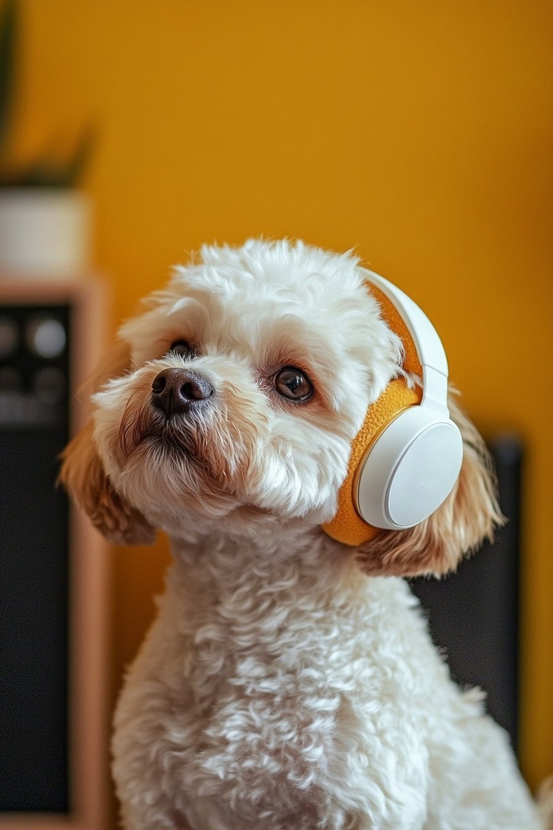 Создано на основе запроса: realistic picture of a Maltipoo listening to music in lofi room