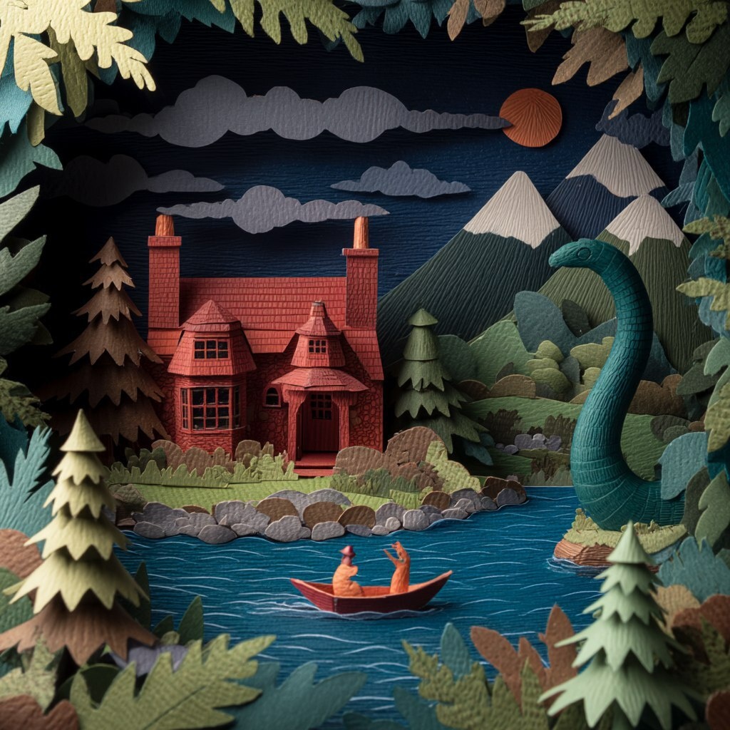 Создано на основе запроса: loch ness monster scene, paper craft, cottage core