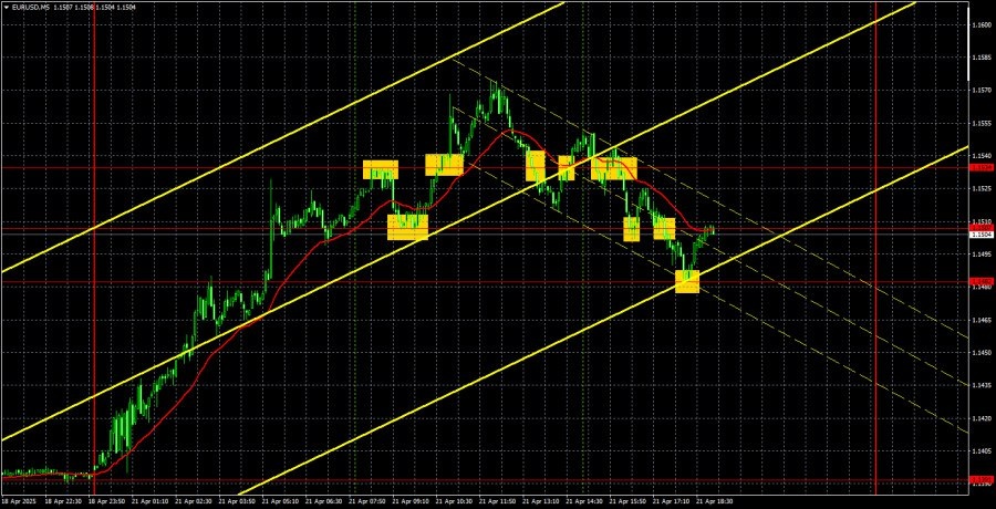 https://basechop.ru/wordpress/?p=39435 Анализ EUR/USD 5M. Валютная пара EUR/USD в течение понедельника вновь взлетела вверх, к луне. На этот раз европейская валюта прибавила «жалкие» 150 пунктов в понедельник, когда ни в Евросоюзе, ни в США не было опубликовано ни одного макроэкономического отчета, а в мире не было ни одной новости, заслуживающей внимания. Даже Дональд Трамп обошелся на выходных и в понедельник без внедрения новых пошлин, санкций и без новых угроз и ультиматумов. Таким образом, спрогнозировать новый взлет пары EUR/USD было невозможно. Однако мы неоднократно говорили, что доллар может обваливаться хоть каждый день. К примеру, фунт стерлингов всю прошлую неделю рос. Даже в те дни, когда никаких новостей и событий не было. Это общая политика участников рынка в данное время, акция под названием «продавай доллар». Технические паттерны или формации на часовом ТФ нет смысла выделять, потому что их нет. Мы имеем дело не с классическим трендом, когда время от времени происход