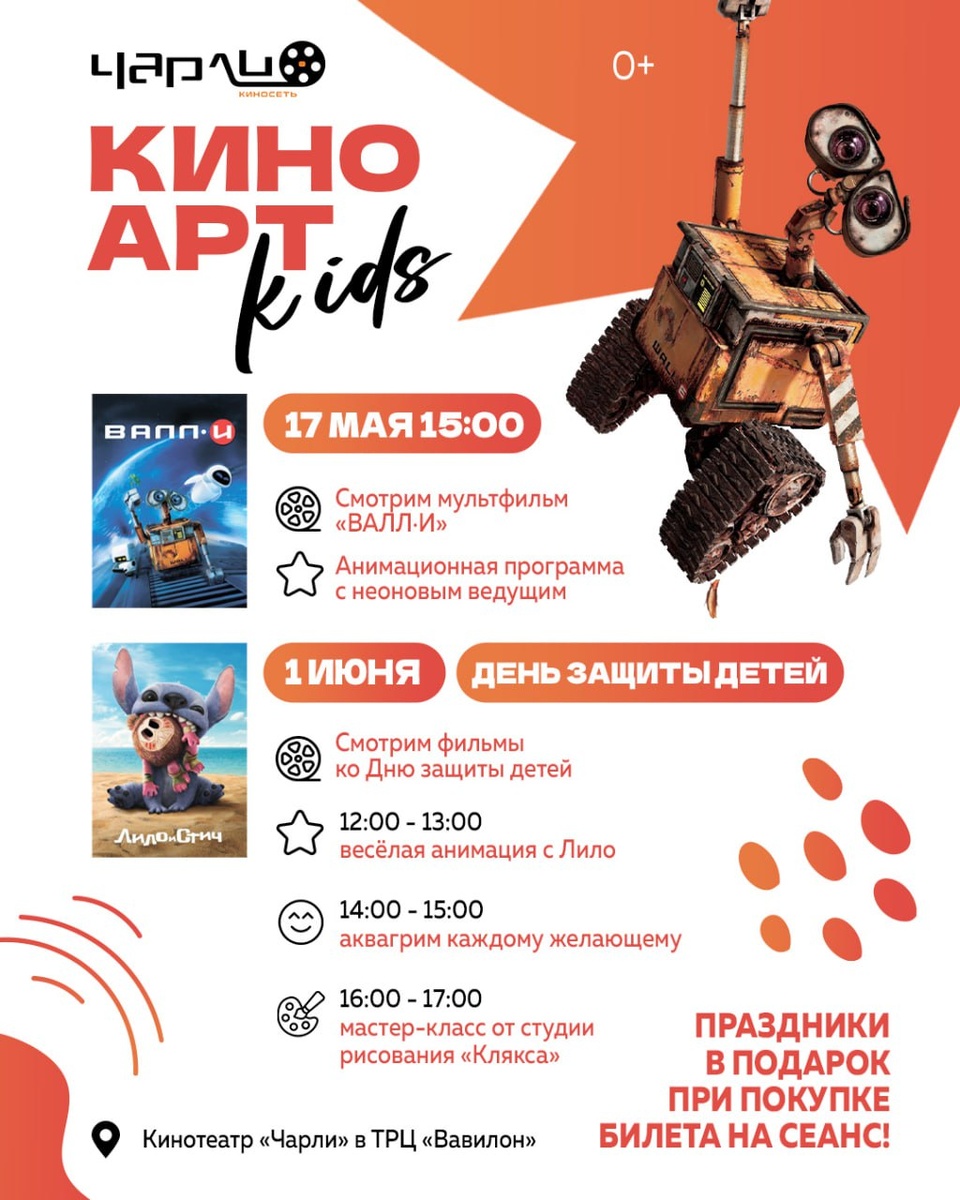Проект КиноАрт kids в кинотеатре «Чарли» ТРЦ «Вавилон»! 17 мая в 15:00 внеземной мультфильм «Валл-и» и игры в фойе с "неоновым" ведущим! А 1 июня большой праздник с просмотром мультфильмов ко Дню защиты детей, в 12:00 со зрителями поиграет Лило из «Лило и Стич», а в 16:00 деток ждёт бесплатный мастер-класс от студии рисования «Клякса»! #яместный
