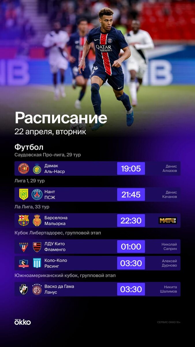 Матч «Аль-Насра» Роналду в саудовской лиге, перенесённая встреча «Нанта» и «ПСЖ», а ещё Ла Лига, Судамерикана и Либертадорес 🔥 В Евролиге и Единой лиге ВТБ пройдут первые игры 1/4. В КХЛ – шестой матч серии «Ак Барса» и «Динамо». 😆 Смотри весь спорт в Okko: https://okko.tv/s/4ot
