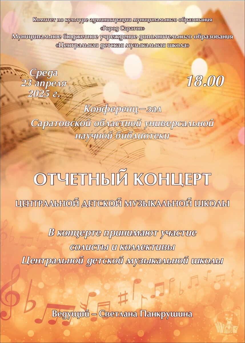 Друзья! 🇷🇺🎖️Приглашаем Вас на концерт «Великой Победе посвящается…». В концерте принимают участие оркестры и хоровые коллективы Центральной детской музыкальной школы. Прозвучат песни и инструментальные произведения военных лет, любимые многими поколениями. Ведущая - Светлана Панкрушина. 🗓 23 Апреля ⏰ 18:00 📍Областная универсальная научная библиотека ул. им. Горького А. М., зд. 40 Вход свободный