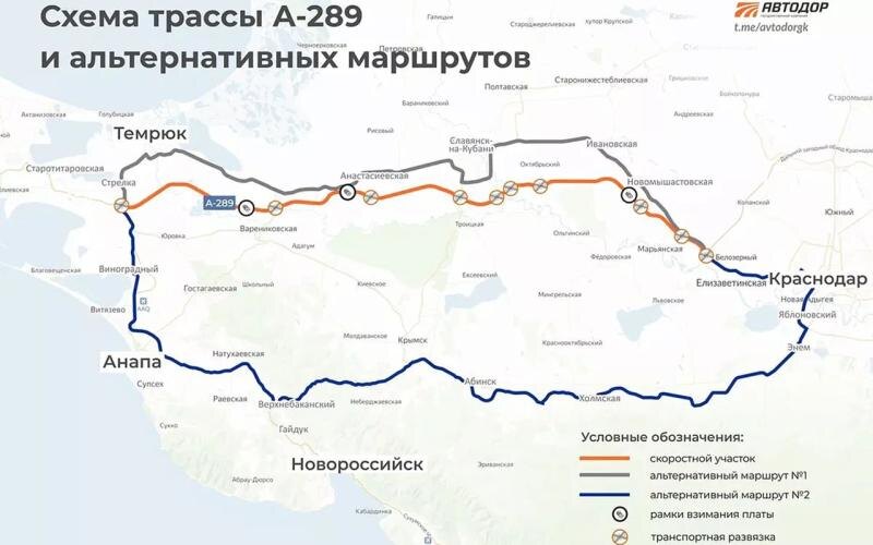 Федеральная трасса А-289 с 22 апреля перешла под управление ГК «Автодор» и стала платной. С декабря 2024 года дорога эксплуатировалась в бесплатном режиме. С 22 апреля текущего года дорога начала эксплуатироваться в платном режиме. На трассе действует безбарьерная система оплаты «Свободный поток». Для владельцев легковушек и мотоциклов проезд будет стоить от 170 до 750 рублей в зависимости от участка. В качестве альтернативы можно пользоваться федеральной автодорогой А-146 «Краснодар — Верхнебаканский», а также трассой, которая проходит через станицу Новомышастовскую и Темрюк. В конце 2024 года губернатор Краснодарского края Вениамин Кондратьев на церемонии открытия автодороги А-289 сообщил, что она даст возможность водителям доезжать от Краснодара до Крымского моста в три раза быстрее — за два часа вместо шести.