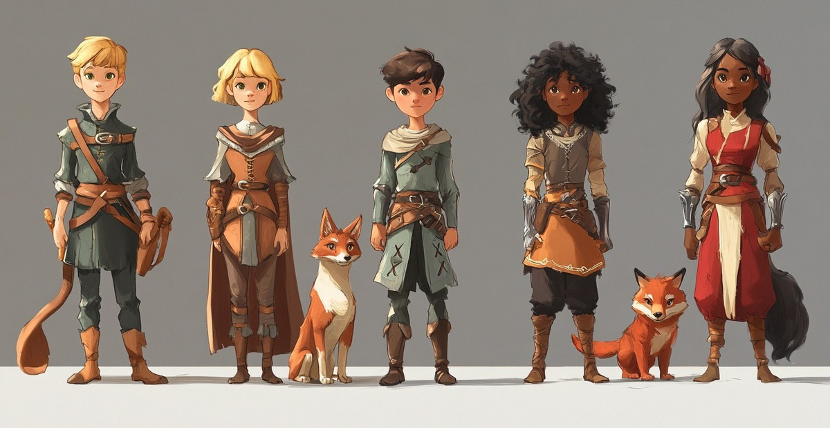 Создано на основе запроса: A group of five character designs for an RPG game, with different body shapes and hair colors. The first is a short-haired blonde girl in medieval holding her brown dog. The second is a long black-haired boy wearing fantasy standing next to his red fox. The third is a female adult with dark skin wearing a tunic outfit. The fourth is a young woman with curly brunette hair dressed as a peasant while walking on two legs like a gorilla; the characters have human proportions.