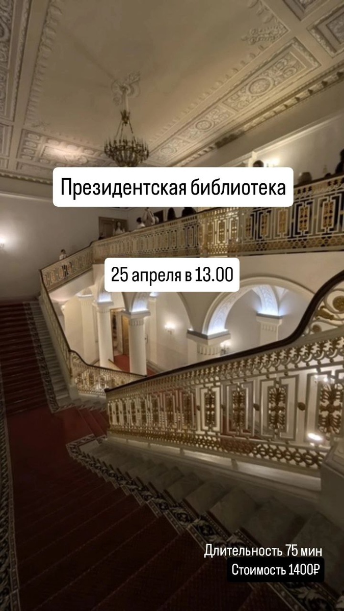 Президентская библиотека 25 апреля в 13.00 Библиотека расположена в историческом центре Санкт-Петербурга, в здании Священного Синода, построенном во второй четверти XIX века по проекту выдающегося архитектора Карла Росси. Приваловнет.рф/президентская-библиотека Стоимость 1400₽/чел. Запись у @Privalov_net_adm Обращаем ваше внимание, что для посещения экскурсии за 4 рабочих дня необходимо прислать паспортные данные: фио, дата рождения, серия\номер паспорта, место рождения, страна проживания, адрес регистрации