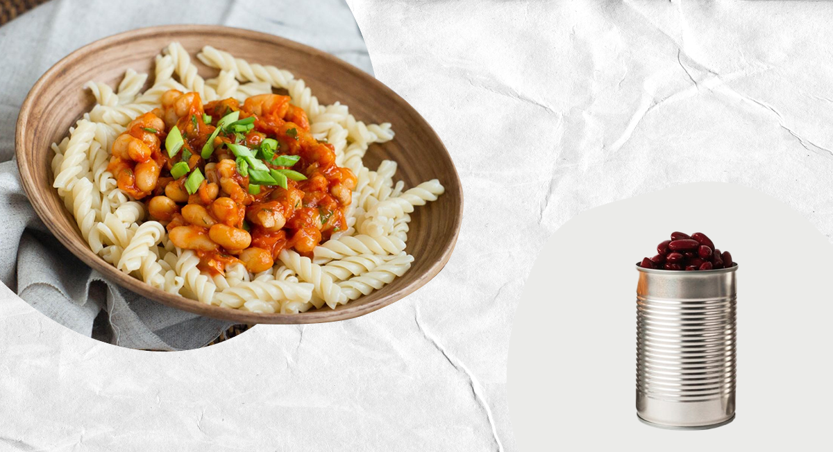 Отвари пасту до состояния аль денте. Затем на оливковом масле обжарь лук и чеснок до мягкости. Добавь к ним томаты и оставь тушиться на 10 минут. После — всыпь банку фасоли, прогрей и приправь по вкусу. Смешай ингредиенты с пастой и перед подачей укрась блюдо свежей зеленью.