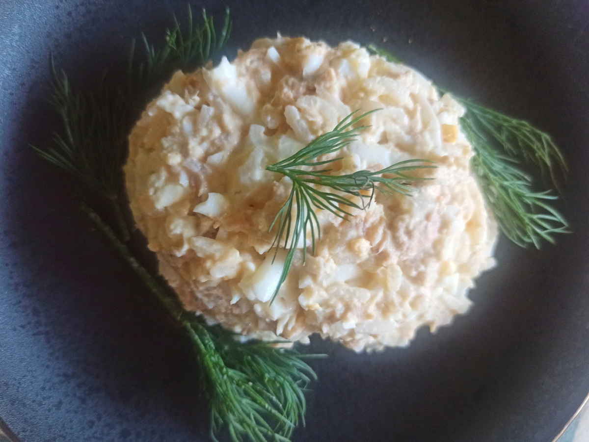 Любимый салат моего внука - с горбушей, рисом и яйцами.
