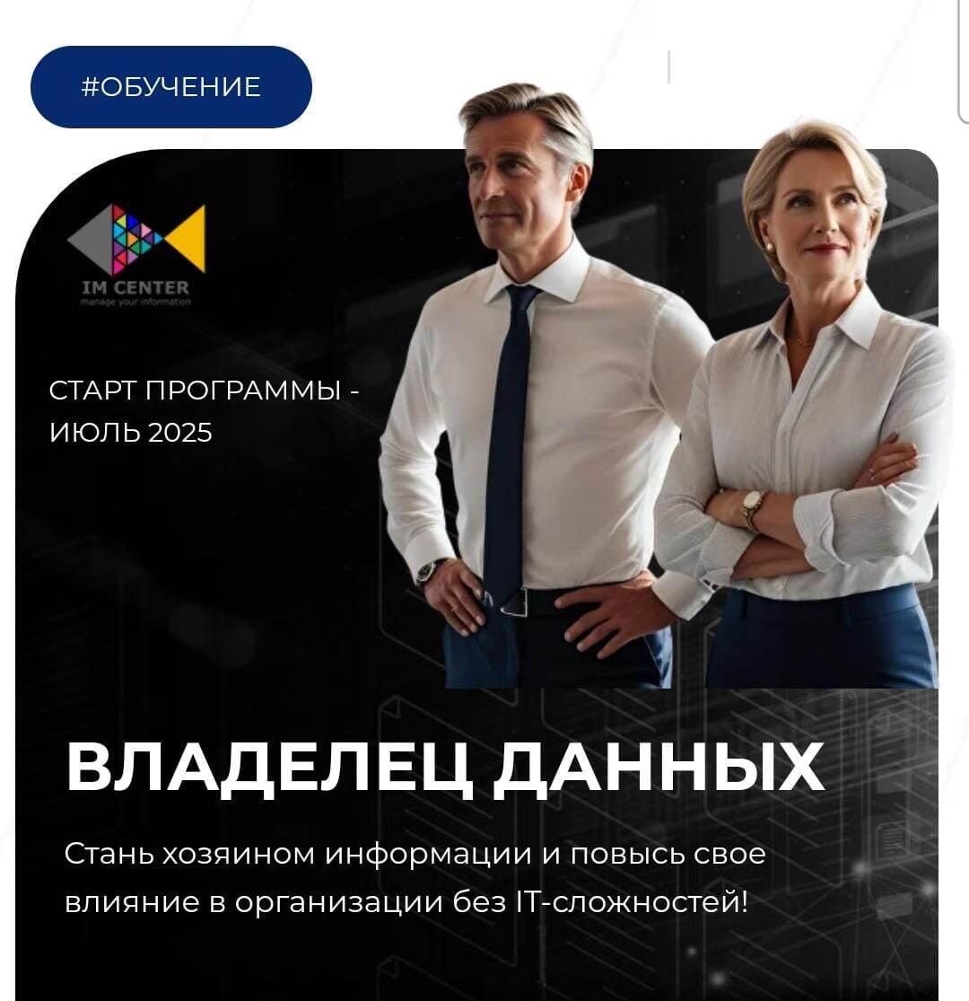 👂Анонс: Старт программы "Владелец данных" в июле 2025! 📢 Друзья, отличные новости! 🗓В июле 2025 года стартует программа "Владелец данных" от IMC👉! Продолжаем вносить свой вклад в развитие культуры управления информацией и формировать мышление для работы с данными как с ключевым активом. Что вы получите? ✅Понимание, как данные влияют на ваш бизнес или карьеру. ✅Простую инструкцию для управления информацией без IT-сложностей ✅Уверенность в принятии решений, основанных на данных. ⏱Специальное предложение: Бесплатная промо-группа Условия: Участие бесплатное для промо-группы, но места ограничены - 20 участников! Хотите стать частью? Оставьте заявку на сайте: ➡️www.im-center.ru/programs/data-owner. 🔗Присоединяйтесь к созданию программы! 🖥Ознакомьтесь с концепцией программы на сайте и поделитесь своими предложениями и пожеланиями. Ваше мнение поможет сделать курс еще лучше!👍 ℹ️Станьте информационным партнером. Если вы представляете медиа, блог, сообщество или IT-компания, дав