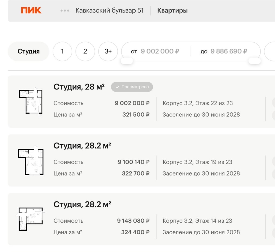 Обратите внимание, ПИК вывел новые корпуса в ЖК «Кавказский бульвар 51». Где минимальная стоимость студий сейчас от 8,9 млн руб. с ключами в июне 2028 года.