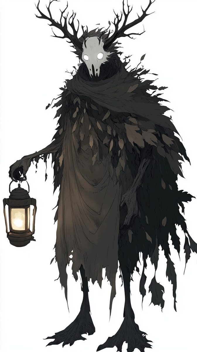 Создано на основе запроса: An anime character design of a woodland wendigo, with dark fur, glowing white eyes, and black antlers on its head. The creature is wearing an old cloak made from tattered leaves and carrying an ancient lantern in one hand. This is a full-body shot of the character concept art, in the style of Studio Ghibli, and is a trending piece on Pixiv Fanbox. --- Автоперевод: Аниме -персонаж дизайн лесного wendigo, с темным мехом, светящимися белыми глазами и черными рогами на голове. Какое твое мнение? 🤔 https://dzen.ru/id/65c0c65c86e4f837c27b24d7 #ИИ #AI #нейросеть #midjourney #art