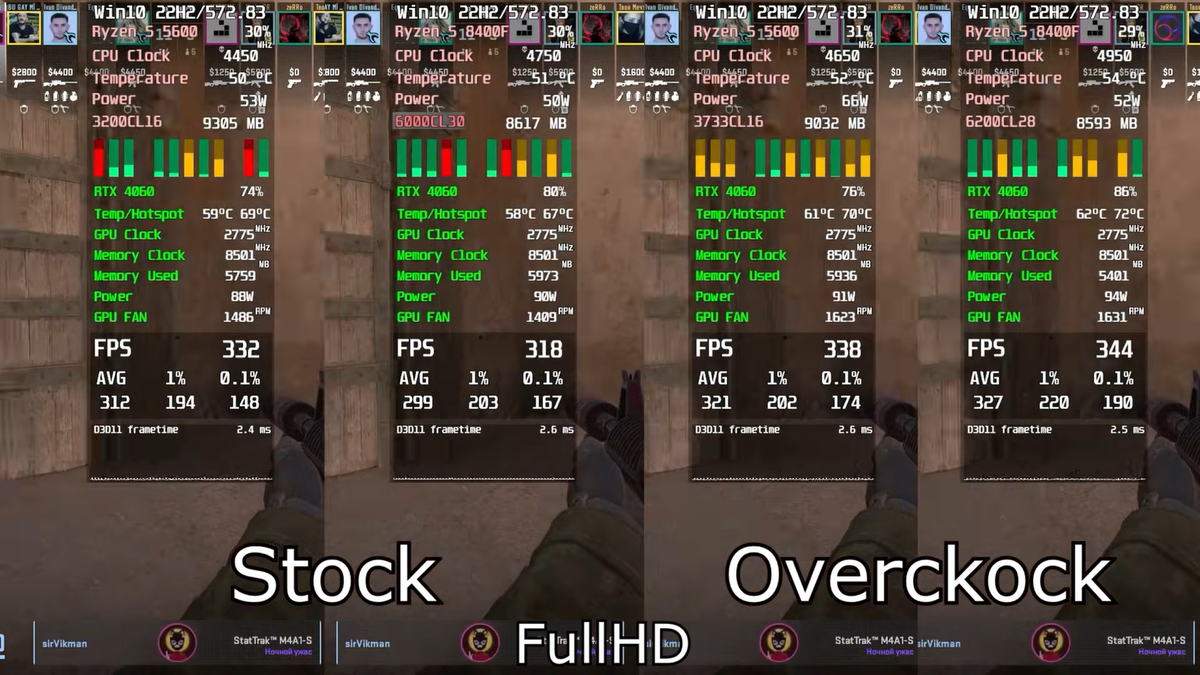 В одном из выпусков на YouTube-канале sirVikman эксперт выяснил, как себя в играх показывают Ryzen 5 8400F и Ryzen 5 5600 с разгоном и без. Тестовый стенд включал, помимо процессоров, матплаты SBR A520M Challenger/ASRock B550M Phantom Gaming 4 (для AM4) и Asus Prime B650M-K (для АМ5), оперативную память Netac Shadow S 2x16 ГБ DDR4 32 ГБ и Patriot Memory DDR5 32 ГБ 2х16 ГБ, видеокарту RTX 4060, SSD Apacer M.2 1 ТБ, кулер для процессора Pentawave PC-Z05E, блок питания Gamemax GP-500G, корпус Miditower ExeGate EVO-8227. Все тесты проводились в двух разрешениях: 1080р и 1440р. Кроме того, были игры с RT: Dragons dogma II, Hogwarts Legacy, Cyberpunk 2077, Spider Man 2, The Witcher 3, Star Wars Jedi Survivor. Со средними замерами вы можете ознакомиться ниже. В CS 2 с пользовательскими настройками графики в Full HD у процессоров примерно одинаковый средний FPS, в 1440р же лидирует уже 5600: 280 к/с против 261 к/с в стоке и 286 к/с против 267 к/с с разгоном. Hunt Showdown запускалась тоже с по