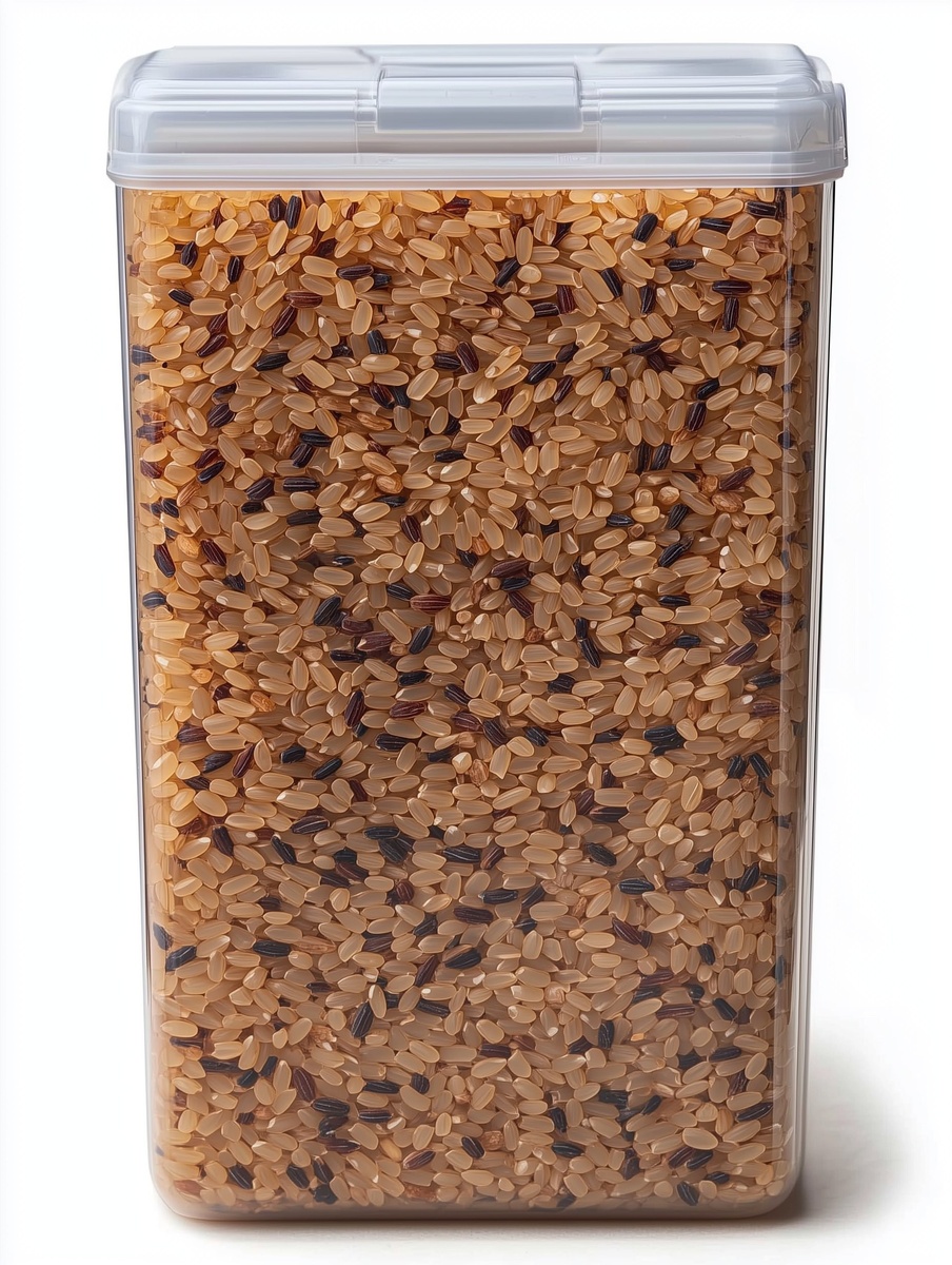 Создано на основе запроса: A pure white background with a rectangular high-capacity plastic storage tank filled with brown rice. Bright and clear.