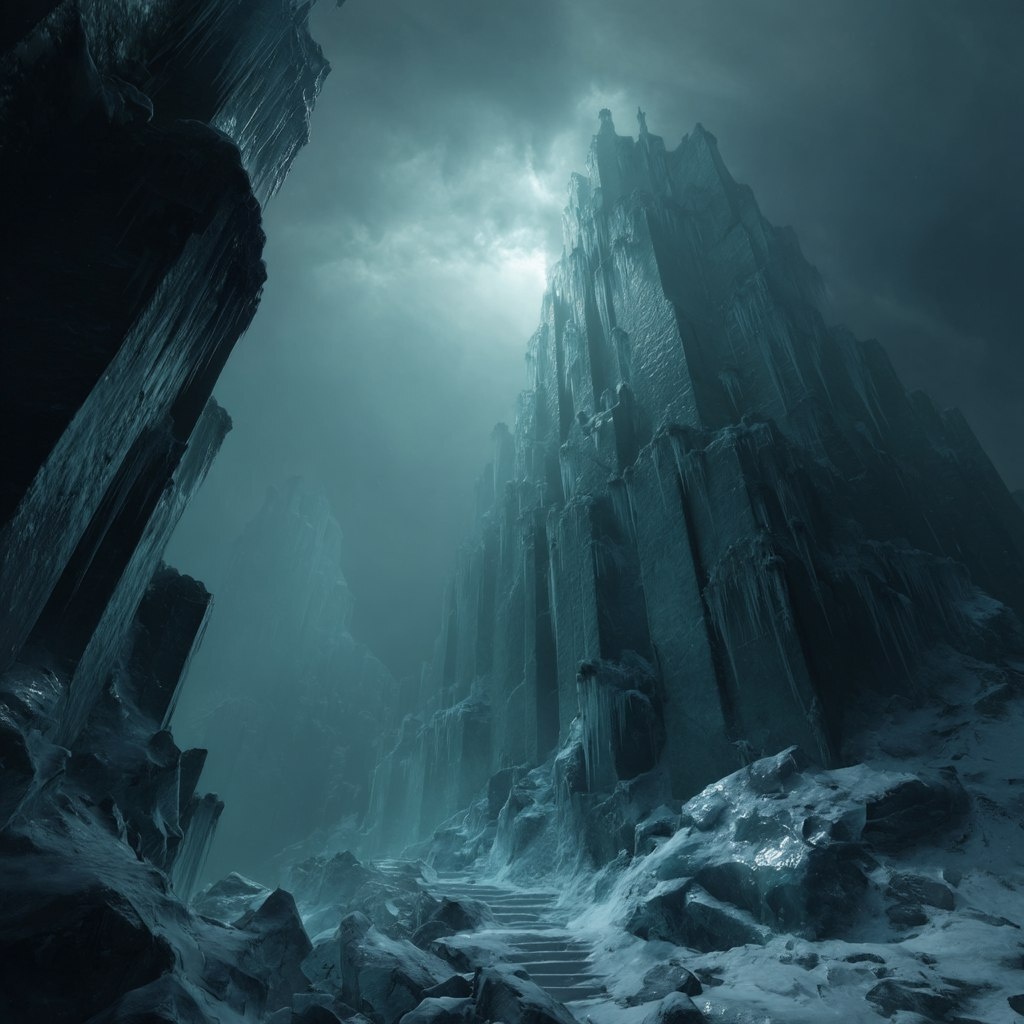 Создано на основе запроса: icy ruins / raw / eerie / foreboding / imposing / intimidating / macabre / menacing / moody / mysterious