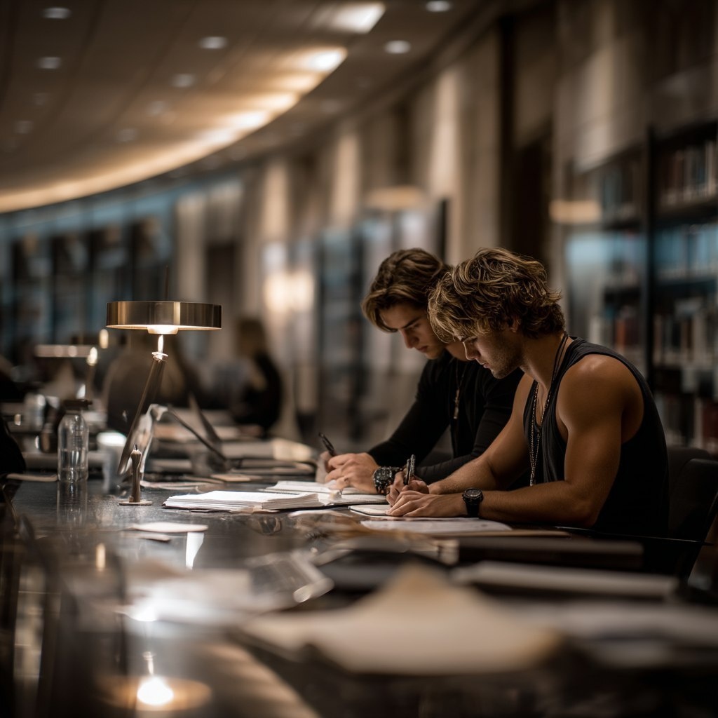 Создано на основе запроса: 2 college male students sitting in a ultra library tutoring each other, wearing a black fitted tank top
