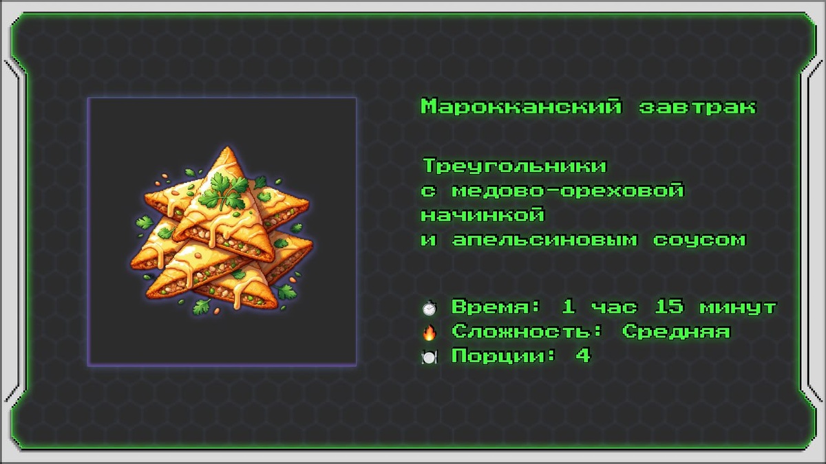 Марокканский завтрак Хрустящие слоёные треугольники с медово-ореховой начинкой и апельсиновым соусом Этот рецепт представляет собой креативную интерпретацию традиционных марокканских бриушей — слоёных пирожков, которые обычно готовят с савойской капустой или мясом. В этой версии используется сладкая медово-ореховая начинка с добавлением ароматного апельсинового соуса, что делает их идеальными для сытного и изысканного завтрака. Информация о рецепте: ⏱️ Время: 1 час 15 минут 🔥 Сложность: Средняя 🍽 Порции: 4 Ингредиенты: Для теста: • 🍞 Мука — 300 г • 💧 Тёплая вода — 150 мл • 🫒 Оливковое масло — 2 столовые ложки • 🧂 Соль — щепотка Для начинки: • 🌰 Миндаль (обжаренный и мелко нарезанный) — 100 г • 🌰 Фисташки (мелко нарезанные) — 50 г • 🍯 Мёд — 3 столовые ложки • 🍊 Апельсиновая цедра (мелко натёртая) — 1 чайная ложка • 🌶 Корица молотая — ½ чайной ложки Для апельсинового соуса: • 🍊 Апельсиновый сок — 100 мл • 🍯 Мёд — 1 столовая ложка • 🌿 Имбирь (натёртый) — ½ чайной