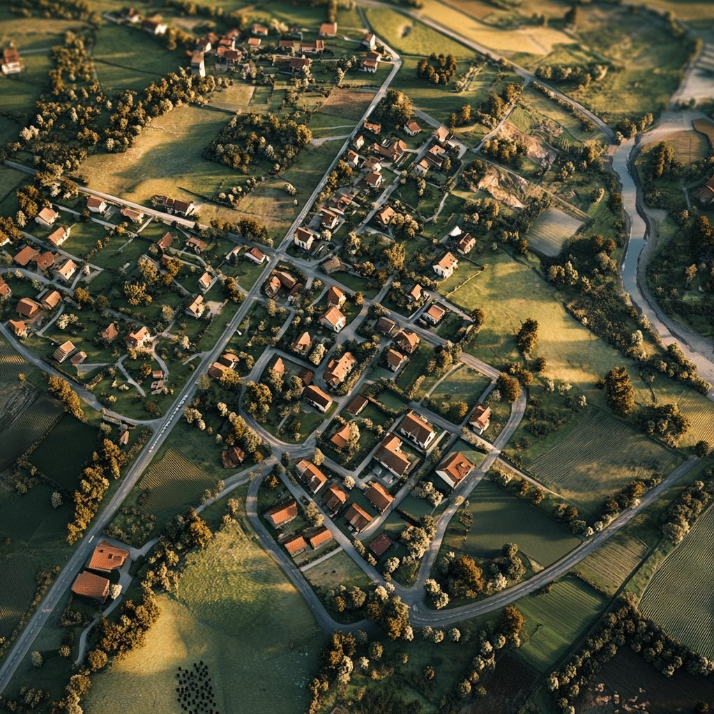 Создано на основе запроса: aerial view of a rural town from an airplane, top-down perspective, small clustered houses, winding roads