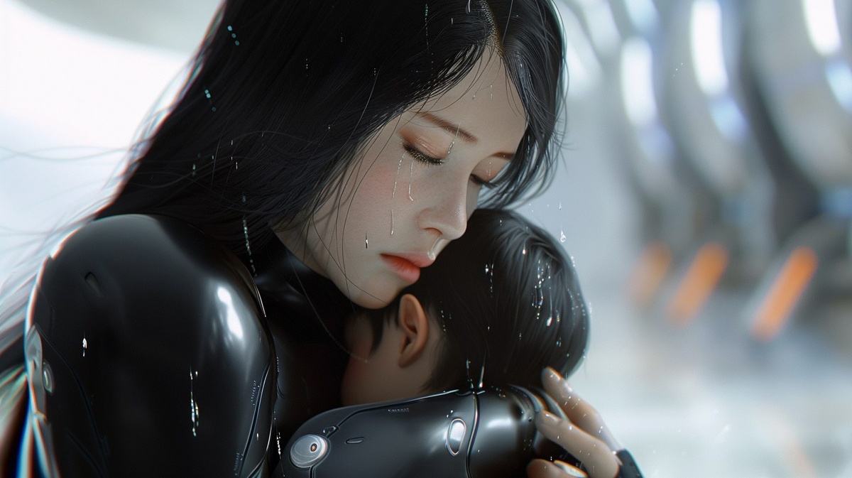 Создано на основе запроса: A breathtakingly beautiful young Korean woman with flawless pale skin and long black hair, wearing a sleek black futuristic bodysuit. She is shown from the waist up, holding a small child tightly in her arms. Her face is captured in a close-up side angle, with a pained, restrained expression --- Автоперевод: Потрясающе красивая молодая корейская женщина с безупречной бледной кожей и длинными черными волосами, одетая в гладкий черный футуристический боди. Отлично выглядит? 🤔 https://dzen.ru/id/65c0c65c86e4f837c27b24d7 #ИИ #AI #нейросеть #midjourney #art