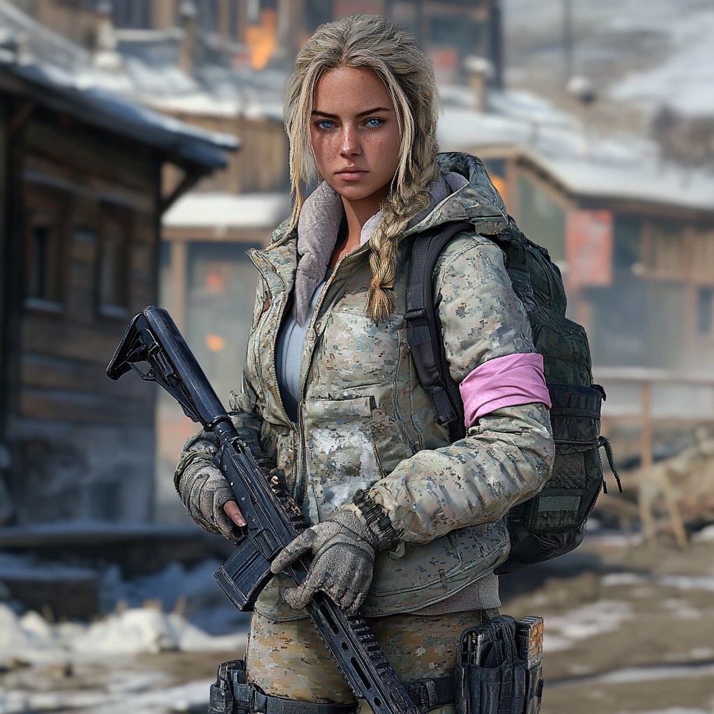 Создано на основе запроса: realistic tan female with blonde hair and blue eyes wearing a snow camo jacket, long snow camo cargo pants, black backpack, pink bandanna armband and carrying an automatic gun in a ghost town --- Автоперевод: Реалистичная коричневая женщина со светлыми волосами и голубыми глазами в снежной камуфляжной куртке, длинные снегоуборочные брюки для грузовых брюк, черный рюкзак, розовая повязка на бандана и автоматическое пистолет в городе -призраке Необычно вышло? 🤔 https://dzen.ru/id/65c0c65c86e4f837c27b24d7 #ИИ #AI #нейросеть #midjourney #art