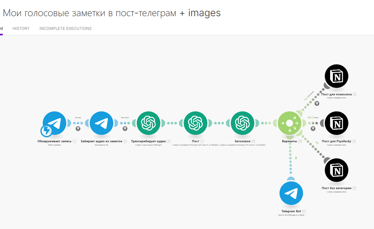 🛠️ make.com для психолога: как я автоматизировала 3 рутинных процесса Сценарии, которые экономят мне часы. Без кода, без боли, с результатом. Make.com — это сервис, который связывает между собой разные инструменты. Ты собираешь цепочку: «получил → обработал → сохранил → отправил». Я — не айтишник, но уже чувствую себя волшебницей. Вот мой первый сложный сценарий, который я собрала и который реально работает: 1️⃣ Мое голосовое сообщение → текст → статья → в Notion (контент-план) Записываю себе голосом идею, размышления, оcознавания → Make сам расшифровывает, запускает GPT, сохраняет как черновик статьи, отправляет все в Notion. А я потом публикую в соцсетях ⚡ В итоге: меньше рутины, больше творчества и времени на живую работу с людьми. Хочешь шаблон сценария — переходи в ТГ- канал "ПрофИИ / Нейросети для психолога и автоматизация"