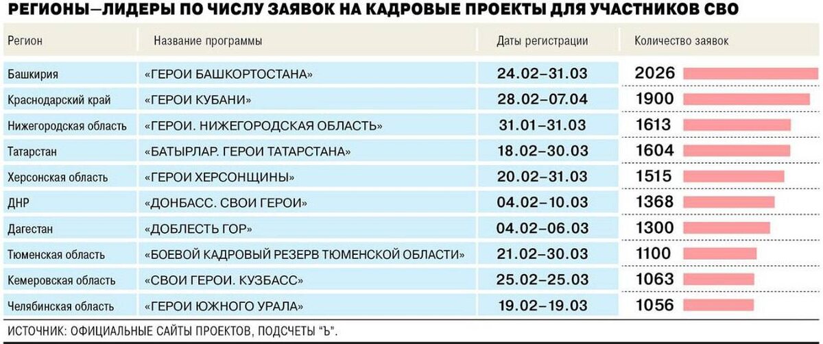 Республика очередной раз показала рекордный результат среди всех регионов России — 2026 участников СВО подали заявки в региональный аналог программы «Время героев» — «Герои Башкортостана». Следом за Башкортостаном: • Краснодарский край ~1900 • Нижегородская область — 1613 Что даёт программа?