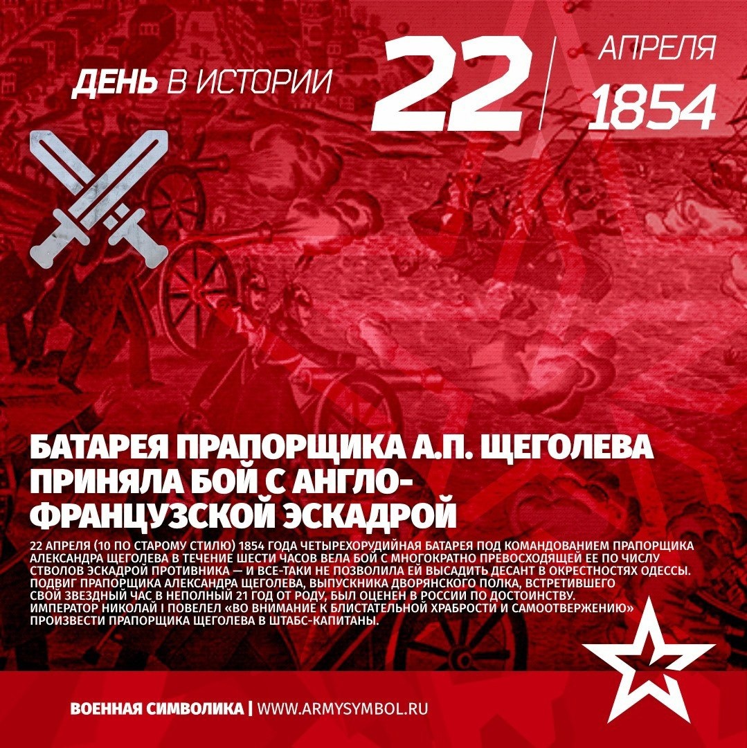 Батарея прапорщика А.П. Щеголева приняла бой с англо-французской эскадрой 22 апреля (10 по старому стилю) 1854 года четырехорудийная батарея под командованием прапорщика Александра Щеголева в течение шести часов вела бой с многократно превосходящей ее по числу стволов эскадрой противника — и все-таки не позволила ей высадить десант в окрестностях Одессы. Подвиг прапорщика Александра Щеголева, выпускника Дворянского полка, встретившего свой звездный час в неполный 21 год от роду, был оценен в России по достоинству. Император Николай I повелел «во внимание к блистательной храбрости и самоотвержению» произвести прапорщика Щеголева в штабс-капитаны. #ПамятныеДатыВоеннойИсторииОтечества #ДеньВИстории #ГодЗащитникаОтечества #80ЛетВеликойПобеды Источник: https://vk.com/wall-60767131_30454 Подпишитесь на наши группы ВКонтакте и в Одноклассниках - читайте, смотрите и комментируйте! Источник