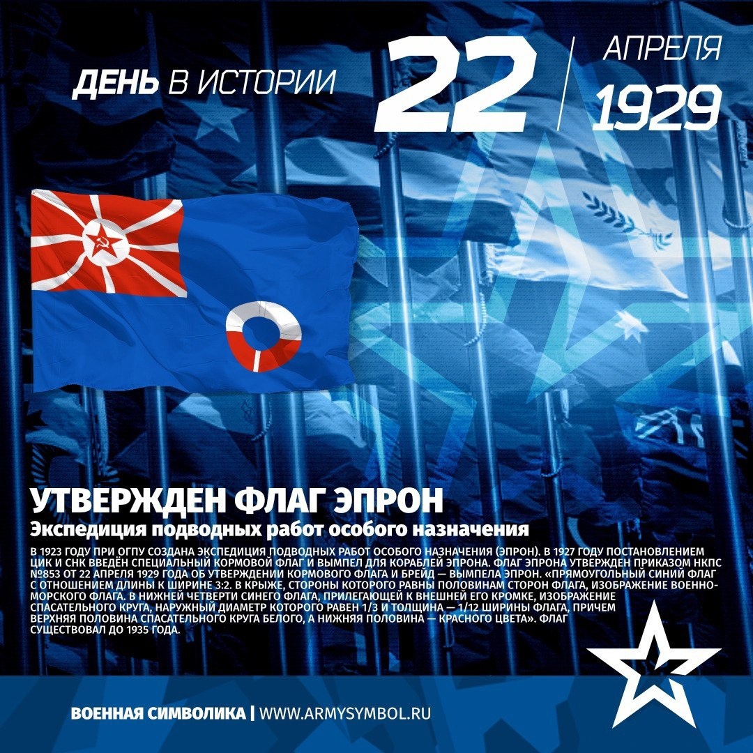 Утвержден флаг ЭПРОН в 1929 Экспедиция подводных работ особого назначения В 1923 году при ОГПУ создана Экспедиция подводных работ особого назначения (ЭПРОН). В 1927 году постановлением ЦИК и СНК введён специальный кормовой флаг и вымпел для кораблей ЭПРОНа. Флаг ЭПРОНа утвержден приказом НКПС №853 от 22 апреля 1929 года об утверждении кормового флага и брейд — вымпела ЭПРОН. «Прямоугольный синий флаг с отношением длины к ширине 3:2. В крыже, стороны которого равны половинам сторон флага, изображение военно-морского флага. В нижней четверти синего флага, прилегающей к внешней его кромке, изображение спасательного круга, наружный диаметр которого равен 1/3 и толщина — 1/12 ширины флага, причем верхняя половина спасательного круга белого, а нижняя половина — красного цвета». Флаг существовал до 1935 года. #ПамятныеДатыВоеннойИсторииОтечества #ДеньВИстории #ГодЗащитникаОтечества #80ЛетВеликойПобеды Источн Подпишитесь на наши группы ВКонтакте и в Одноклассниках - читайте, смотрите и ко